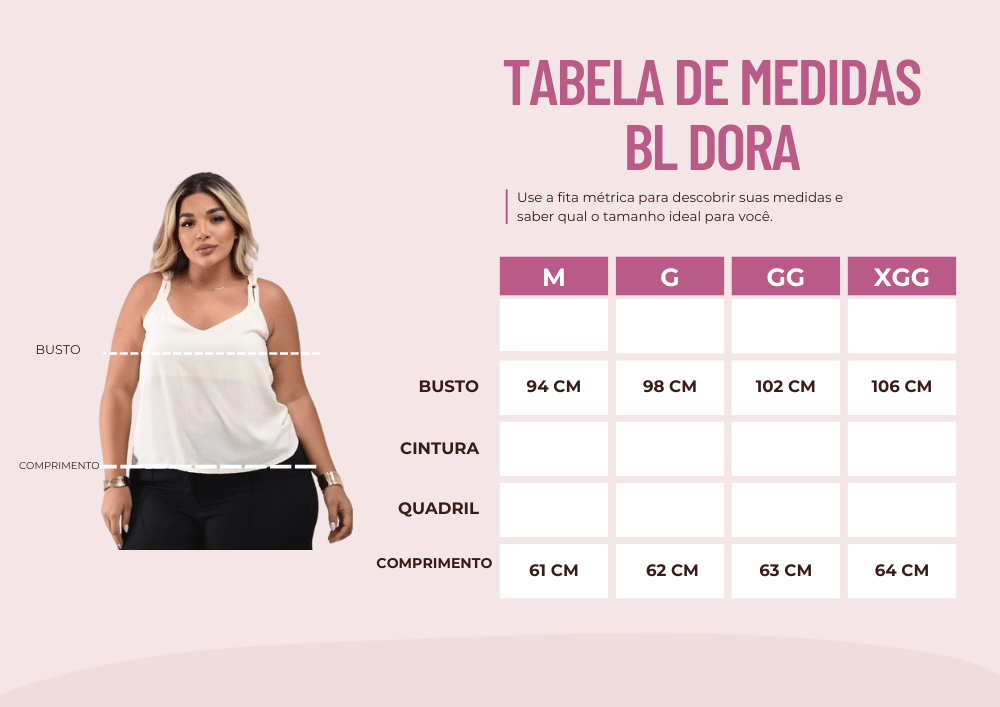 A Blusa Dora é feita em tecido leve, perfeita para quem busca conforto e estilo no dia a dia. Seu decote em V e as alças médias com detalhes sutis conferem um toque delicado à peça. Com modelagem soltinha e caimento fluido, ela valoriza a silhueta de forma natural, ideal para diversas ocasiões. Combine com jeans ou saias para um visual fresco e moderno.