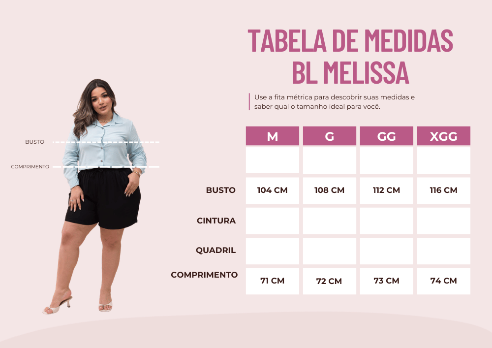 A Blusa Melissa é perfeita para quem busca conforto e elegância no dia a dia. Confeccionada em tecido leve, apresenta modelagem soltinha que garante um caimento fluido e confortável. Possui gola colarinho tradicional, fechamento frontal por botões e mangas longas com punho ajustado. O decote discreto adiciona um toque sofisticado, tornando a peça versátil para diversas ocasiões.