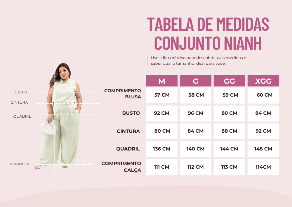 O Conjunto Nianh é perfeito para quem busca estilo e conforto em um look moderno. A blusa sem mangas apresenta um decote rente ao pescoço com gola de babadinhos, criando um franzido delicado e caimento soltinho. A calça de cintura alta destaca a silhueta com cós marcado, pregas frontais e modelagem wide leg ampla, além de bolsos laterais embutidos para praticidade. Ideal para diversas ocasiões com elegância e leveza.